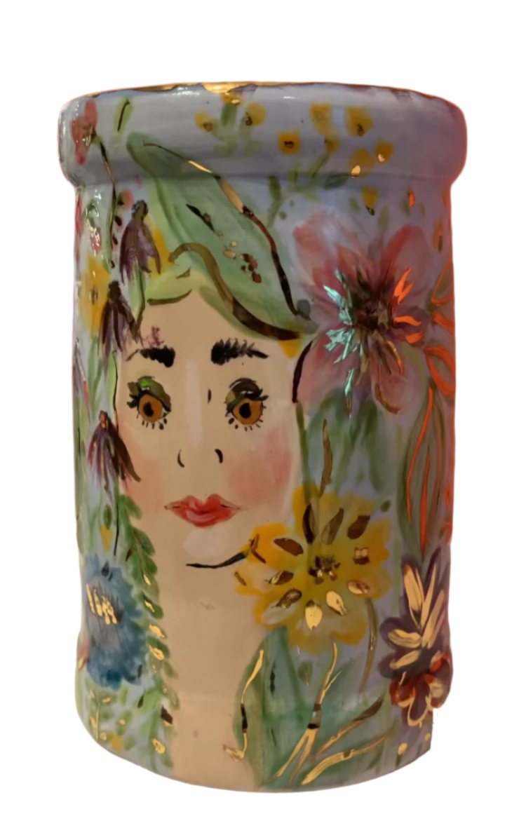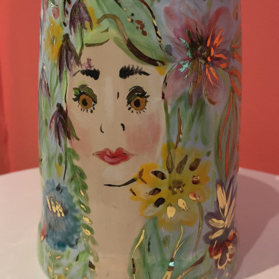 Most beer steins are created with men in mind.Not these! Women drink beer and deserve a special glass of their own! This mug is meticulously hand painted by me over several days. Fired and then....BOOM! I add so much 22kt gold that it literally sparkles! Makes a beautiful gift for yourself or that special someone!