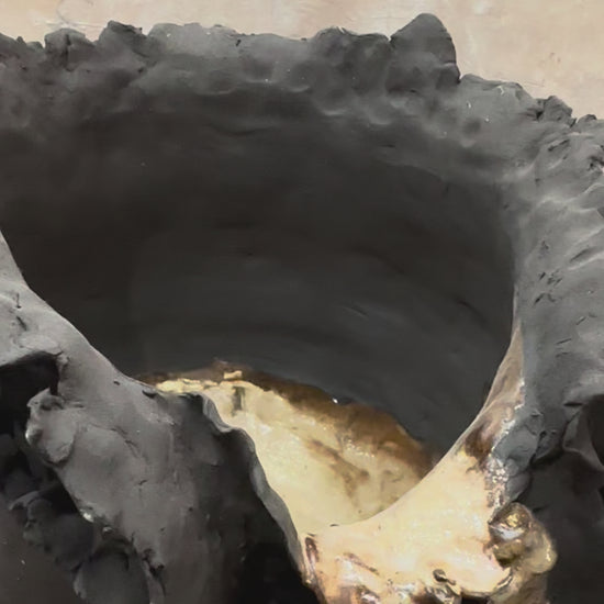 This one-of-a-kind bowl is a stunning piece of sculptural pottery that captures the raw, powerful beauty of nature. Hand-formed from dark stoneware clay, the vessel features an intentionally rugged, organic shape with a dramatic, wavy rim that evokes a sense of natural movement.