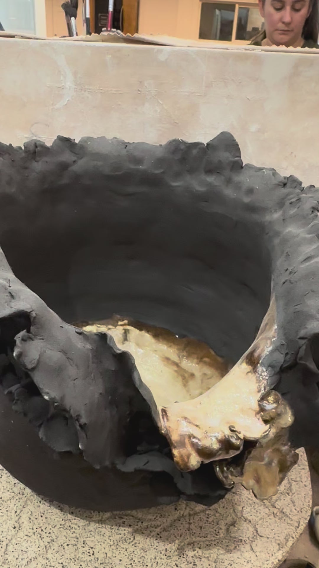 At its core, a contrasting pool of rich, glossy molten glass creates a mesmerizing interior. This unexpected detail adds a pop of brilliant color and smooth texture, beautifully highlighting the raw, earthy feel of the clay. The result is a piece that feels both ancient and modern, a perfect blend of natural elements and artistic expression.