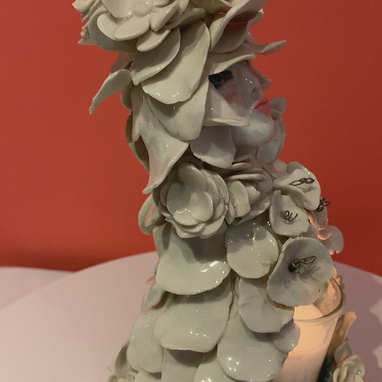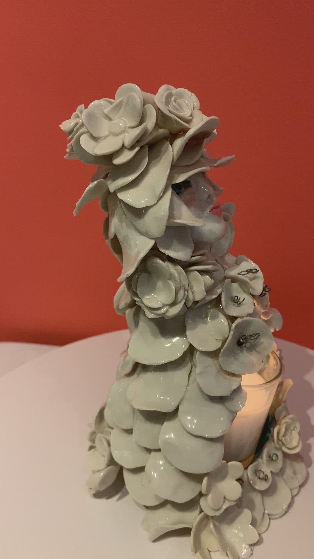 while longingly awaiting spring I created Fleur from the finest English porcelain and accented her with 24kt gold and a touch of turquoise blue. The hours spent creating and forming her petals and flowers were, in my opinion, well worth it.