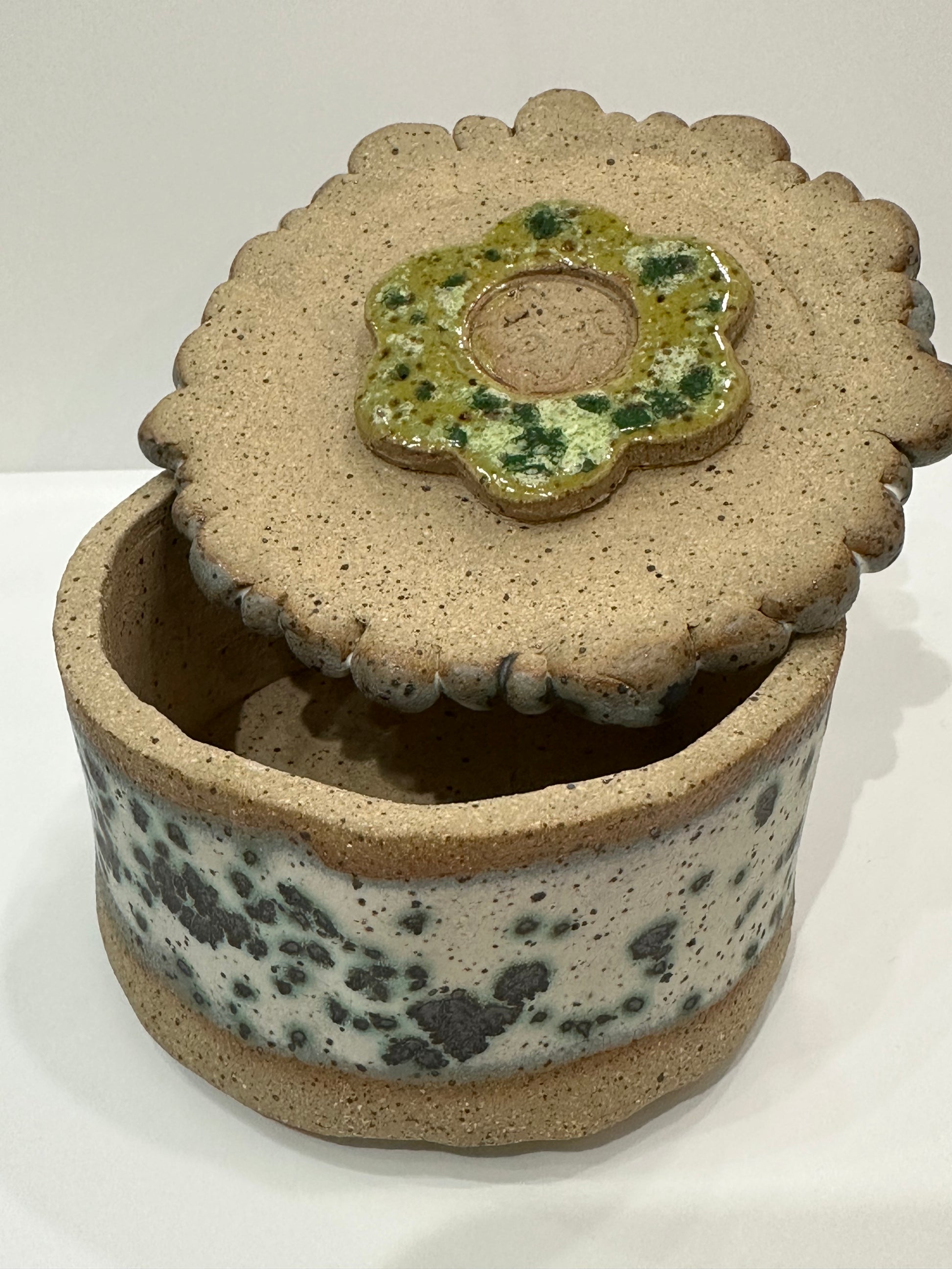 Speckled Reverie is a charming ceramic container with a playful personality. Its speckled beige, green, white, and black surface feels like a little patch of nature you can hold. The flower-shaped lid adds a pop of whimsy, while the bubbly black-and-white edge brings fun texture and contrast. This piece blends simple shapes with joyful details—perfect for anyone who loves handcrafted art with a splash of earthy charm.