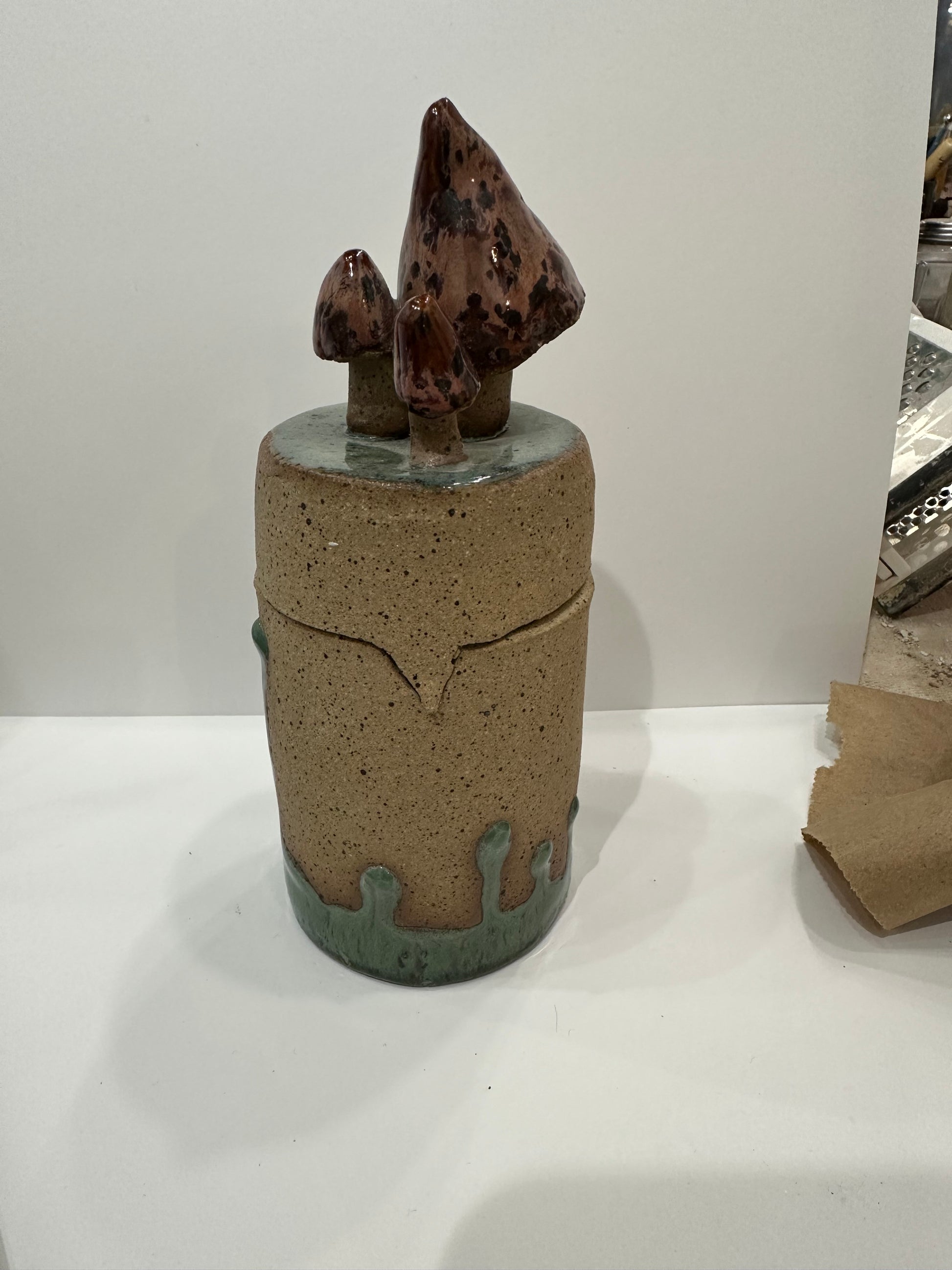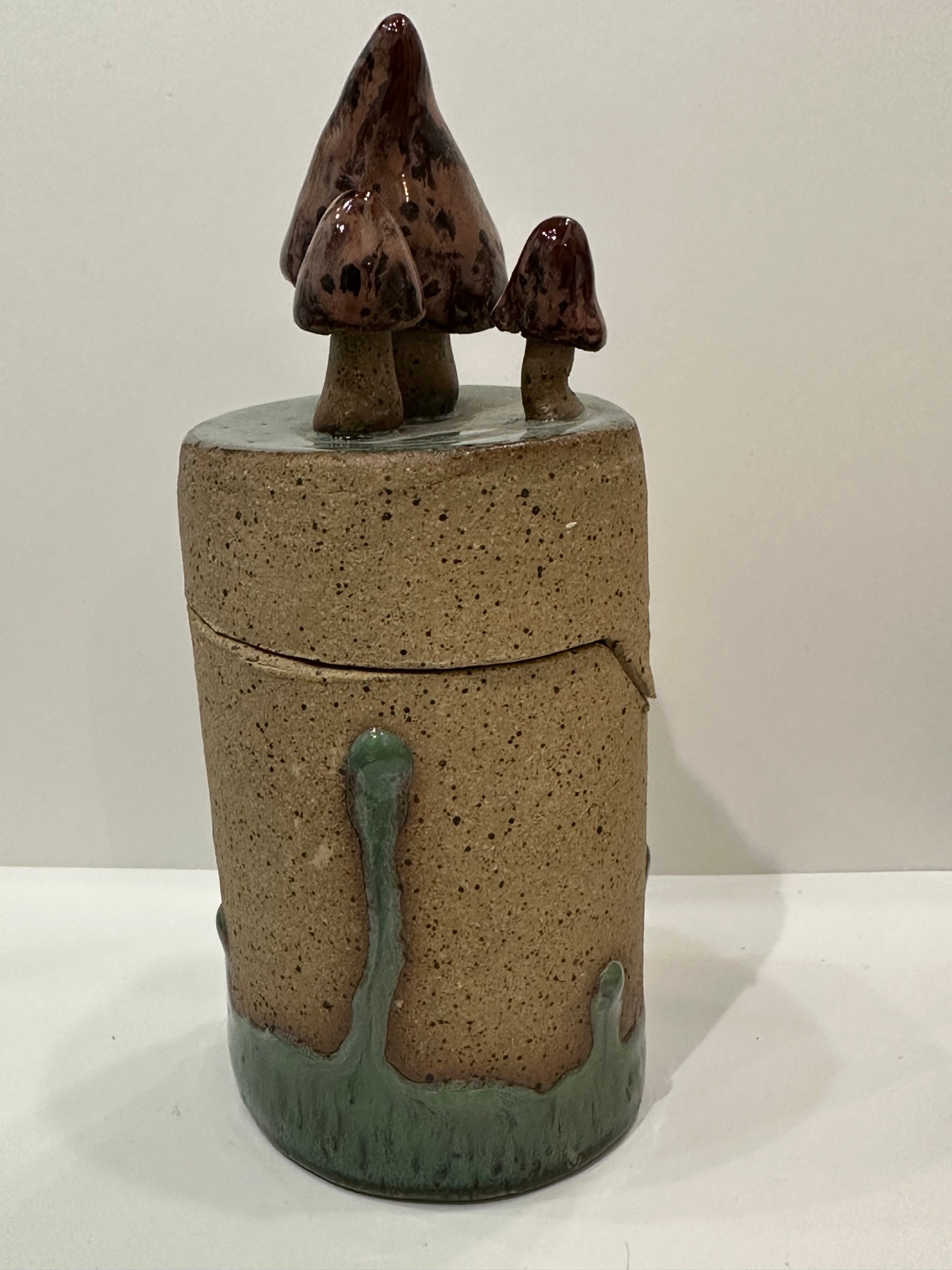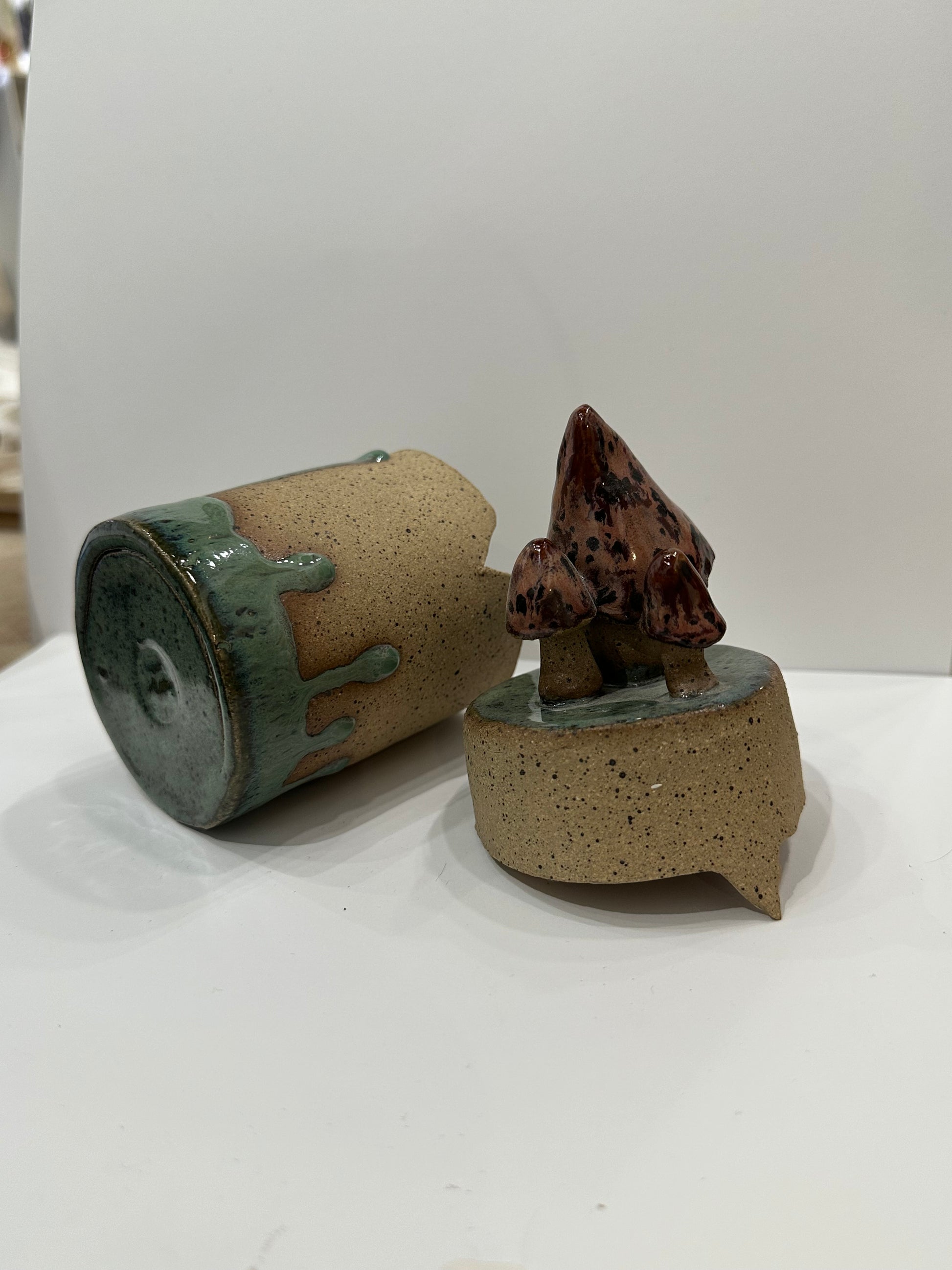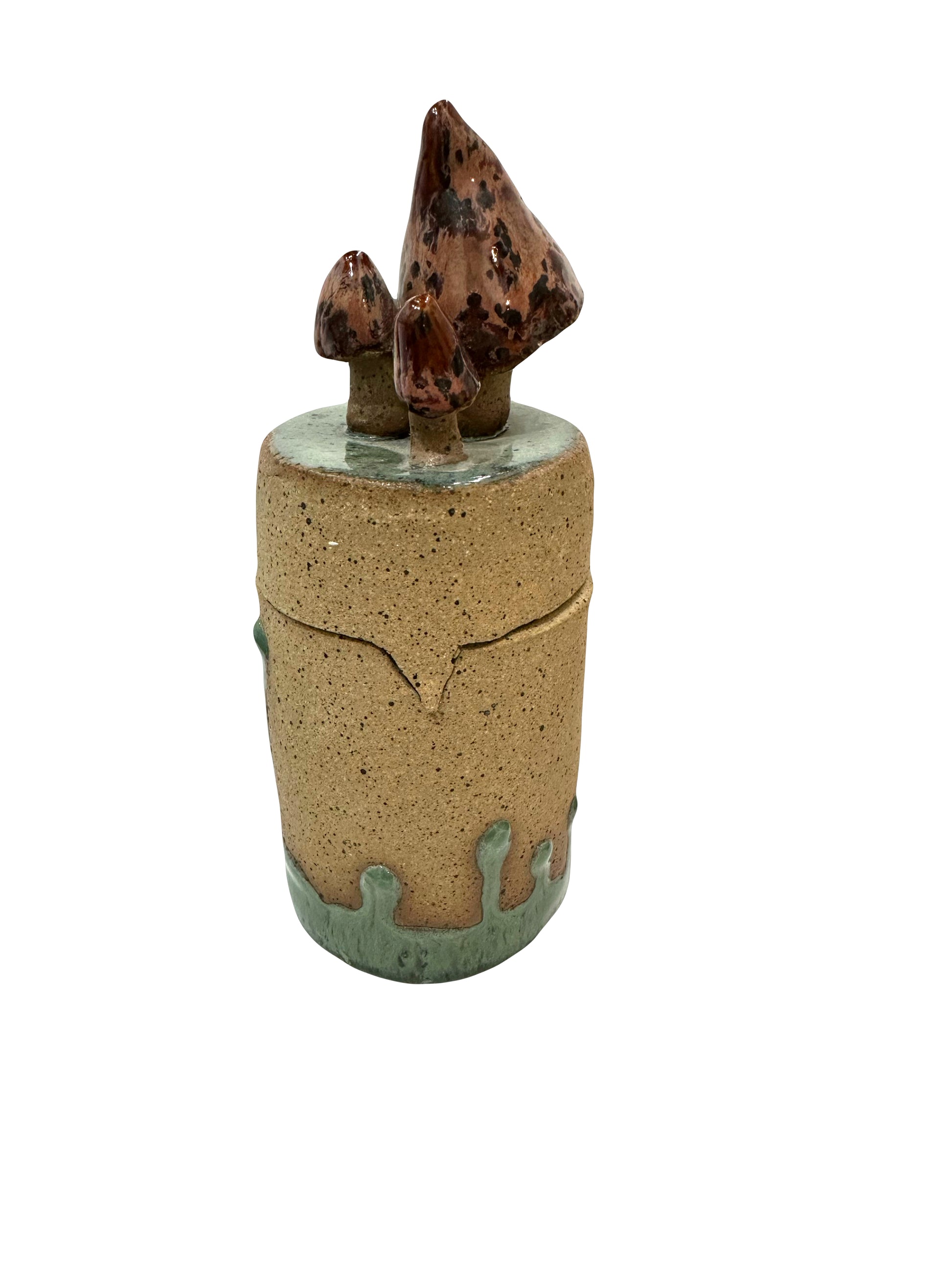 Verdant Caps is a playful ceramic sculpture featuring a sandy-textured cylinder topped with three glossy, speckled mushroom shapes. A splash of green glaze near the base hints at fresh growth, bringing a touch of nature indoors. With its simple, earthy vibe and clever two-part design, this piece is all about celebrating the quiet beauty of the natural world—fun, fresh, and ready to brighten any space.